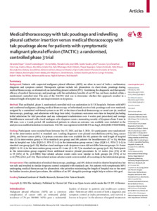Patients with suspected malignant pleural effusions (MPE) are often in need of both a confirmatory diagnosis and symptom control. Therapeutic options include talc pleurodesis via chest drain, poudrage during medical thoracoscopy, or alternatively an indwelling pleural catheter (IPC). Combining the diagnostic and therapeutic efficacy of medical thoracoscopy and poudrage with the ambulatory benefits of an IPC has not been studied within a randomised controlled trial. The aim of the TACTIC trial was to determine whether this approach resulted in a reduced length of hospital stay and improvements in dyspnoea.