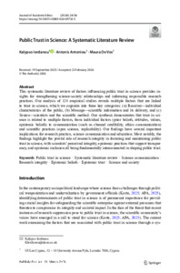 This systematic literature review of factors influencing public trust in science provides insights for strengthening science-society relationships and informing responsible research practices. Our analysis of 124 empirical studies reveals multiple factors that are linked to trust in science, which we organize into three key categories: (a) Receiver—individual characteristics of the public, (b) Message—scientific information and its delivery, and (c) Source—scientists and the scientific method. Our synthesis demonstrates that trust in science is related to multiple factors, from individual factors (prior beliefs, attitudes, values, epistemic beliefs) to communication (such as channel credibility, ethics communication) and scientific practices (open science, replicability). Our findings have several important implications for research practice, science communication and education. Most notably, the findings highlight the pivotal role of research integrity in fostering and maintaining public trust in science, with scientists’ perceived integrity, epistemic practices that support transparency, and epistemic inclusion all being fundamentally interconnected in shaping public trust.