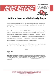 Media and Promotion Office, UCLan (2002) News release: Matthew cleans up with his handy design. Other. University of Central Lancashire (UCLan), Preston.