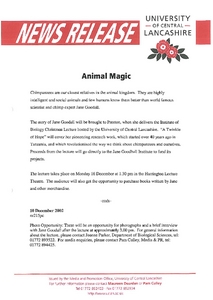 Media and Promotion Office (2002) News release: Animal Magic. Other. University of Central Lancashire (UCLan), Preston.