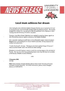Media and Promotion Office (2002) News release: Local mum achieves her dream. Other. University of Central Lancashire (UCLan), Preston.