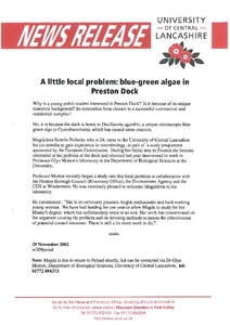 Media and Promotion Office (2002) News release: A little local problem: blue-green algae in Preston Dock. Other. University of Central Lancashire (UCLan), Preston.
