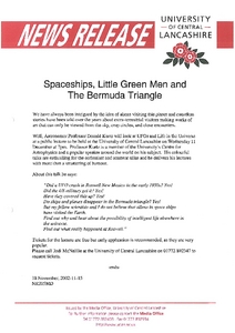 Media and Promotion Office (2002) News release: Spaceships, Little Green Men and The Bermuda Triangle. Other. University of Central Lancashire (UCLan), Preston.