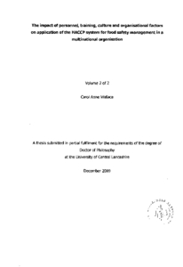 In the setting of a multinational food company, this research has developed new tools,assessed HACCP knowledge levels, investigated HACCP team decision-making processes, assessed the validity of working HACCP Plans and considered how cultural and organisational dimensions impact HACCP application. This multifaceted approach has facilitated deconstruction of HACCP learning and development, leading to an understanding of key factors involved in effective HACCP in a global manufacturing context.