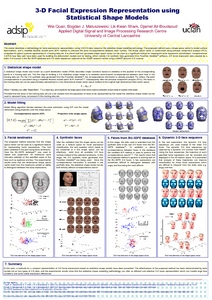 This poster describes a methodology for facial expressions representation, using 3-D/4-D data, based on the statistical shape modelling technology. The proposed method uses a shape space vector to model surface deformations, and a modified iterative closest point (ICP) method to calculate the point correspondence between each surface. The shape space vector is constructed using principal component analysis (PCA) computed for typical surfaces represented in a training data set. It is shown that the calculated shape space vector can be used as a significant feature for subsequent facial expression classification. Comprehensive 3-D/4-D face data sets have been used for building the deformation models and for testing, which include 3-D synthetic data generated from FaceGen Modeller® software, 3-D facial expression data caputed by a static 3-D scanner in the BU-3DFE database and 3-D video sequences captured at the ADSIP research centre using a 3dMD® dynamic 3-D scanner.