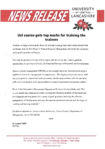 Media and Promotion Office (2002) News release: Uni course gets top marks for training the trainers. Other. University of Central Lancashire (UCLan), Preston.