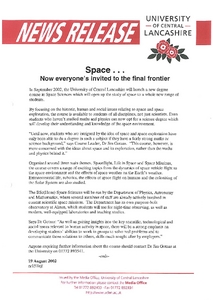 Media and Promotion Office (2002) News release: Space...Now everyone's invited to the final frontier. Other. University of Central Lancashire (UCLan), Preston.