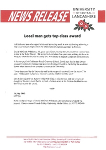 Media and Promotion Office (2002) News release: Local man gets top class award. Other. University of Central Lancashire (UCLan), Preston.