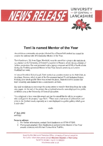 Media and Promotion Office (2002) News release: Terri is named Mentor of the Year. Other. University of Central Lancashire (UCLan), Preston.