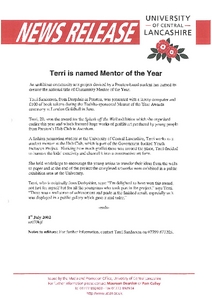 Media and Promotion Office (2002) News release: Terri is named Mentor of the Year. Other. University of Central Lancashire (UCLan), Preston.