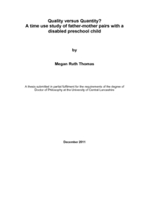 Thomas, Megan Ruth (2011) Quality versus Quantity? A time use study of father-mother pairs with a disabled preschool child. Doctoral thesis, University of Central Lancashire.