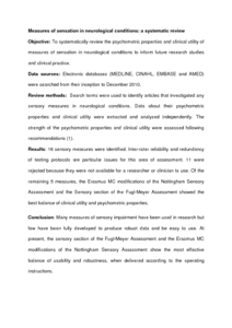 Objective: To systematically review the psychometric properties and clinical utility of measures of sensation in neurological conditions to inform future research studies and clinical practice.Data sources: Electronic databases (MEDLINE, CINAHL, EMBASE and AMED) were searched from their inception to December 2010.Review methods: Search terms were used to identify articles that investigated any sensory measures in neurological conditions. Data about their psychometric properties and clinical utility were extracted and analyzed independently. The strength of the psychometric properties and clinical utility were assessed following recommendations.1Results: Sixteen sensory measures were identified. Inter-rater reliability and redundancy of testing protocols are particular issues for this area of assessment. Eleven were rejected because they were not available for a researcher or clinician to use. Of the remaining five measures, the Erasmus MC modifications of the Nottingham Sensory Assessment and the Sensory section of the Fugl-Meyer Assessment showed the best balance of clinical utility and psychometric properties.Conclusion: Many measures of sensory impairment have been used in research but few have been fully developed to produce robust data and be easy to use. At present, the sensory section of the Fugl-Meyer Assessment and the Erasmus MC modifications of the Nottingham Sensory Assessment show the most effective balance of usability and robustness, when delivered according to the operating instructions.