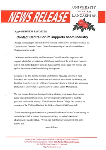 Media and Promotion Office (2002) News release: Contact Centre Forum supports boom industry. Other. University of Central Lancashire (UCLan), Preston.