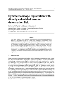 Papiez, Bartek and Matuszewski, Bogdan orcid iconORCID: 0000-0001-7195-2509 (2012) Symmetric image registration with directly calculated inverse deformation field. Annals of the BMVA, 2012 (6). pp. 1-14.