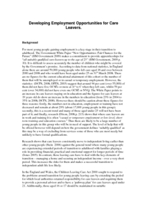 This article describes an action research project carried out in North West England that aimed to assist Children’s Services Departments and Care Trusts in developing their strategies for supporting care leavers into employment and training. The study found a range of models and approaches that can be utilised to develop local and regional partnerships offering employment and training opportunities designed to meet the needs of care leavers. Relevant questions about the extent to which such opportunities should be ring-fenced or targeted on particular fields of employment are identified.