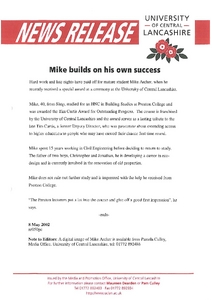 Media and Promotion Office (2002) News release: Mike builds on his own success. Other. University of Central Lancashire (UCLan), Preston.