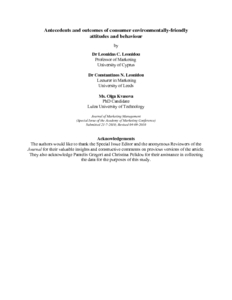 Leonidou, Leonidas C., Leonidou, Constantinos N. and Kvasova, Olga (2010) Antecedents and outcomes of consumer environmentally friendly attitudes and behaviour. Journal of Marketing Management, 26 (13-14). pp. 1319-1344. ISSN 0267-257X