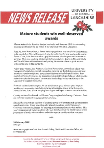 Media and Promotion Office (2002) News release: Mature students win well-deserved awwards. Other. University of Central Lancashire (UCLan), Preston.