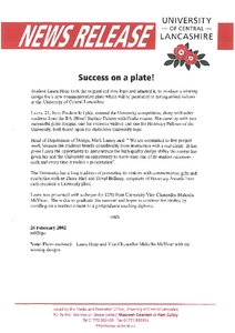 Media and Promotion Office (2002) News release: Success on a plate! Other. University of Central Lancashire (UCLan), Preston.