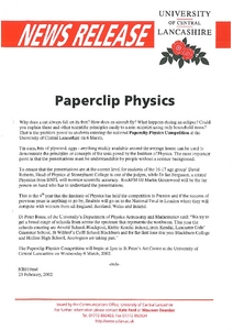 Media and Promotion Office (2002) News release: Paperclip Physics. Other. University of Central Lancashire (UCLan), Preston.
