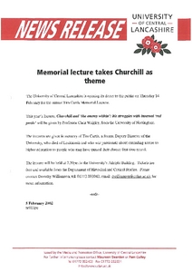 Media and Promotion Office (2002) News release: Memorial lecture takes Churchill as theme. Other. University of Central Lancashire (UCLan), Preston.