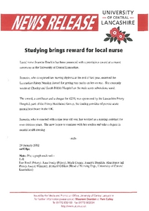 Media and Promotion Office (2002) News release: Studying brings reward for local nurse. Other. University of Central Lancashire (UCLan), Preston.
