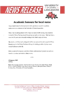 Media and Promotion Office (2002) News release: Academic honours for local nurse. Other. University of Central Lancashire (UCLan), Preston.