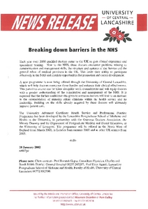 Media and Promotion Office (2002) News release: Breaking down barriers in the NHS. Other. University of Central Lancashire (UCLan), Preston.