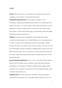 Design/methodology/approach: The study adopts a quantitative survey methodology, employing self-administered questionnaires at two UK sporting events (athletics and cricket). To isolate the impact of sponsorship, questionnaires were also distributed to comparison sample groups not exposed to the sponsorship activities. The elements of consumer-based brand equity are operationalised in line with Aaker‟s (1996) brand equity measurement tool.
