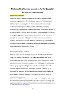 A significant aspect of learning contexts is the way in which semiotic artefacts mediate learning within them. The Literacies for Learning in Further Education (LfLFE) project is researching the role of texts and associated communicative practices in constructing and mediating teaching and learning, in shaping communities, in constructing and sustaining relationships, and in helping students to achieve their goals. A particular aim of the project is to identify ways in which people can bring literacy practices from one context into another to act as resources for learning in the new context. In this paper we explain what we mean by ‘literacy practices’, demonstrate the textuality of learning contexts through examples from contrasting curriculum areas, and show how learning can be enhanced by mobilising literacy practices from one context to another.