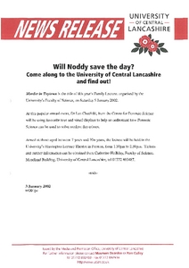 Media and Promotion Office (2002) News release: Will Noddy save the day? Come along to the University of Central Lancashire and find out! Other. University of Central Lancashire (UCLan), Preston.