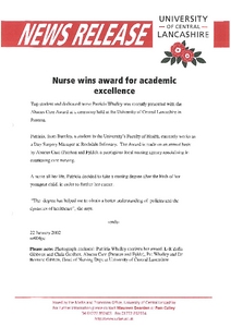 Media and Promotion Office (2002) News release: Nurse wins award for academic excellence. Other. University of Central Lancashire (UCLan), Preston.