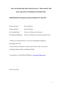 Conclusion. Self-monitoring reduces blood pressure by a small but significant amount. Meta-regression could only account for part of the observed heterogeneity.