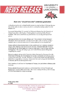 Media and Promotion Office (2003) News release: Mum who "should have died" celebrates graduation. Other. University of Central Lancashire (UCLan), Preston.