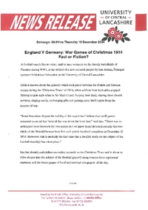 Media and Promotion Office (2003) News release: England V Germany: War Games of Christmas 1914 Fact or Fiction? Other. University of Central Lancashire (UCLan), Preston.