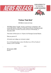 Media and Promotion Office (2003) News release: 'Follow That Bird'. Other. University of Central Lancashire (UCLan), Preston.