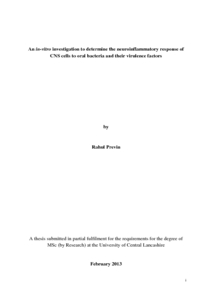 Previn, Rahul (2013) An in-vitro investigation to determine the neuroinflammatory response of CNS cells to oral bacteria and their virulence factors. Masters thesis, University of Central Lancashire.