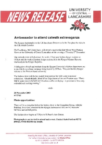Media and Promotion Office (2003) News release: Ambassador to attend catwalk extravaganza. Other. University of Central Lancashire (UCLan), Preston.