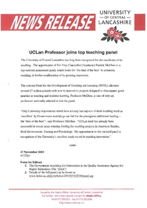 Media and Promotion Office (2003) News release: UCLan Professor joins top teaching panel. Other. University of Central Lancashire (UCLan), Preston.