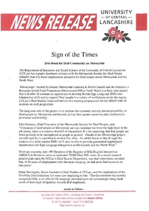 Media and Promotion Office (2003) News release: Sign of the Times. Other. University of Central Lancashire (UCLan), Preston.