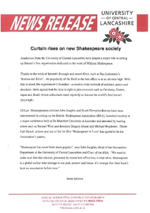 Media and Promotion Office (2003) News release: Curtain rises on new Shakespeare society. Other. University of Central Lancashire (UCLan), Preston.