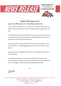 Media and Promotion Office (2003) News release: Teach 'UR' mum to 'txt'. Other. University of Central Lancashire (UCLan), Preston.