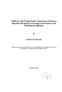 Edwards, Maria E B (2009) Children's and Young People's Experiences of Being in Hospital: Disruption, Uncertainty, Powerlessness and Restoring Equilibrium. Doctoral thesis, University of Central Lancashire.
