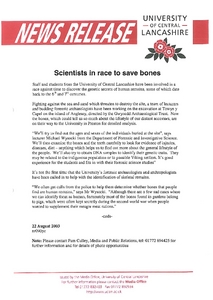 Media and Promotion Office (2003) News release: Scientists in race to save bones. Other. University of Central Lancashire (UCLan), Preston.