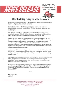 Media and Promotion Office (2003) News release: New building ready to open its doors. Other. University of Central Lancashire (UCLan), Preston.