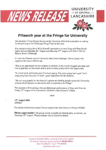 Media and Promotion Office (2003) News release: Fifteenth year at the Fringe for University. Other. University of Central Lancashire (UCLan), Preston.