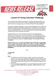 Media and Promotion Office (2003) News release: Launch of Young Volunteer Challenge. Other. University of Central Lancashire (UCLan), Preston.