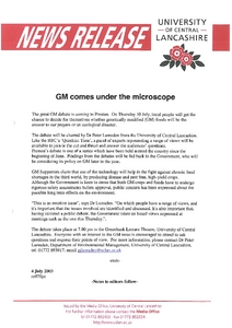 Media and Promotion Office (2003) News release: GM comes under the microscope. Other. University of Central Lancashire (UCLan), Preston.