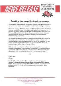 Media and Promotion Office (2003) News release: Breaking the mould for local youngsters. Other. University of Central Lancashire (UCLan), Preston.