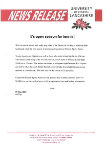 Media and Promotion Office (2003) News release: It's open season for tennis! Other. University of Central Lancashire (UCLan), Preston.